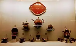Pottery was something used by everyone and was one of the most prolific crafts in 19th-century India. This was a time when European influence was affecting Indian pottery, which had until then evolved in accordance with locally available raw materials, regional craftsmanship, and community needs. Thus, India and its regions had traditionally harboured several styles such as kagazi or thin-walled slip pottery from Patan and Bahwalpur, Bidri art or smoked and burnished black ceramics with silver inlay from Bengal and Azamgarh, the red and white Kutch pottery are held in the museum collection.[6] The collection represents Rajasthan as well as India to the west.[7] Although, it was generally assumed that India was skilled in production of unglazed pottery, coloured slipware, burnished surfaces, and in previous glazed pottery had also been developed by Indian craftsmen. The glazed earthenware ranging from domestic vessels to tiles, architectural elements and decorative objects are displayed. The collection evidences that Indian craftsmanship illustrated artistic terracotta tiles from temples of Gaur, Pandua and Bengal to Islamic calligraphy and geometric patterns Multan, Peshawar, and Sindh. The collection includes works of the Madras, Bombay, and Jaipur schools. In the process of supplying samples to the museum for exhibition, they developed new techniques.[6]