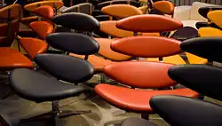 Some 20 years later, yet another variant was presented at the furniture fair in Cologne, receiving a good press but not selling too well. Nevertheless, Erik Jørgensen's firm persisted. In 1997, the chair was presented both at the Cologne fair and at the Scandinavian Furniture Fair at the Bella Center in Copenhagen. This time it was a resounding success. The Corona was used at the 2002 EU Summit in Copenhagen, the year after Volther died. Today, with its elliptical, blow-up cushions, it has reached iconic status, becoming Jørgensen's most successful item, with sales of almost 3,000 a year.[2][3]