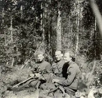 As organized partisan resistance was becoming significantly weaker, Jonas Žemaitis and Morkūnas reportedly once made plans to get fake documents and move to Poland and further abroad.[24] In 1952 the MGB captured a high-ranking partisan officer by the name of Leonas Juška-Kariūnas, who gradually revealed information like communicators, liaisons and other headquarter information. In exchange for freedom, Juška also agreed to participate in eliminating the rest of the partisans.[25] The MGB often unsuccessfully tried to invite Morkūnas via letter to meet and discuss various partisan matters by using recruited former partisans.[26] The agents succeeded in June 1953 in luring Morkūnas to the forest of Plauginiai. In the ensuing fight, Morkūnas was shot dead.[8][6] His sister Juzefa Morkūnaitė-Lakštingala was also a partisan of the Prisikėlimas district who died on 9 August 1950.[9][23]