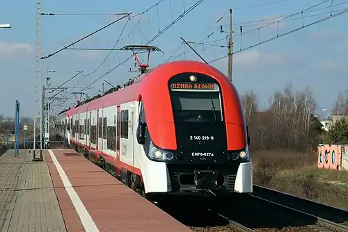 Poznań Junikowo railway station is a railway station serving the south west of the city of Poznań, in the Greater Poland Voivodeship, Poland.[1] The station opened in 2007 and is located on the Warsaw–Kunowice railway. The train services are operated by Przewozy Regionalne and Koleje Wielkopolskie. At the station there is also a small freight yard for trains serving businesses in the area.