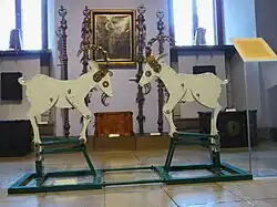 A legend behind the original addition of the goats to the clock mechanism states that a cook, while preparing a banquet for the voivode and other dignitaries, had burnt a roast deer, and attempted to replace it by stealing two goats from a nearby meadow. The goats escaped and ran up the town hall tower, where they attracted the attention of the townspeople when they began to butt each other (according to some versions, this drew attention to a fire which might otherwise have done significant damage). Because of the entertainment provided, the voivode pardoned both the cook and the goats, and ordered that two mechanical goats be incorporated into the new clock being made for the building.