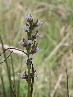 Prasophyllum caricetum, commonly known as the Cathcart leek orchid,[2] is a species of orchid endemic to a small area of southern New South Wales. It has a single tubular, bright green leaf and up to twenty five green, white and purplish flowers crowded on the flowering stem. It grows in montane swamps near Cathcart.