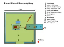 The archeological complex of Preah Khan Kampong Svay (Khmer: ព្រះខ័ននៅកំពង់ស្វាយ), also known as Prasat Bakan (according to local pronunciation), or Bakan Svay Rolay, is located 100 km east of Angkor, in the Preah Vihear province of Cambodia. It stands as the largest single religious complex ever built during the Angkorian Era, as its exterior enclosure is over 22 km square,[1] even if the isolated location makes it one of the less-visited Angkorian sites.