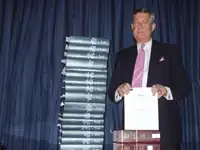 U.S. Rep John Linder holding the 132 page Fair Tax Act in contrast to the more than 60,000 pages of tax code laws and regulations currently in effect.