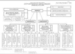 Following the Romanian Revolution of 1989, a 1990 law brought back the prefecture as an "organ of state administration with general competences", composed of one prefect, two deputy prefects, one secretary and seven members. The law specified how the institution should be organised as well as its attributes. The office—one that represented the Government locally and headed devolved public services of ministries and other agencies—was enshrined in the constitution passed by referendum in December 1991, as well as by a law that year and in 2001. Further legislative reform began with the 2004 Law on the Prefect.[1] This de-politicised the office of prefect and deputy prefect, making them high public functionaries who occupy their positions through competitive selection. It also changed the office of general secretary ("director-general" from 1991 to 1997) into that of deputy prefect, so that each prefect was assisted by two deputy prefects,[5] a number cut to one in 2010.[6] In 2021, the prefects' status was changed to that of public dignitaries, allowing them to be members of political parties. At the same time, the office of general secretary was restored.[7]