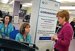 The worldwide pandemic of COVID-19 occurred during Sturgeon's second term as first minister. To contain and limit the number of affected people in Scotland, Sturgeon and the Scottish Government highlighted a number of measures advised by NHS Scotland, initially maintaining effective hand washing.[83] The first confirmed case of the virus in Scotland was announced on 1 March 2020, when a resident in Tayside had tested positive. In the following days, Sturgeon issued further advice and guidance as the number of positive cases began to increase, but had said that closures of public places such as schools and shops "would be reviewed".[83]