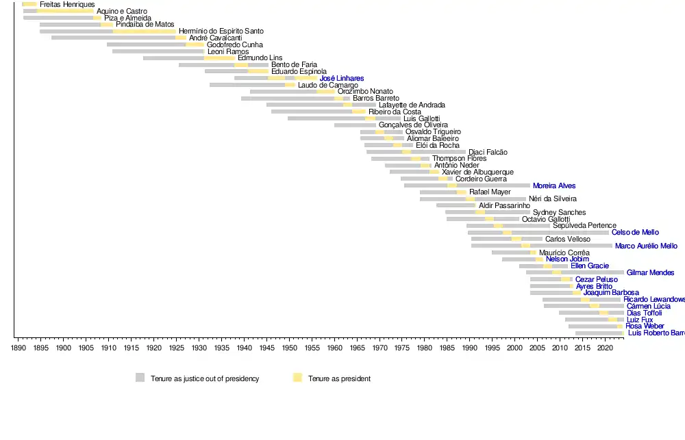 The President of the Supreme Federal Court is fourth in the Brazilian presidential line of succession and can hold the office of President of the Federal Senate in exceptional situations. The longest presidency was held by Hermínio do Espírito Santo for 13 years and 312 days, while the shortest was held by Leoni Ramos for 23 days.[6] The current President is Justice Luís Roberto Barroso, who has held the position since 28 September 2023.[7]