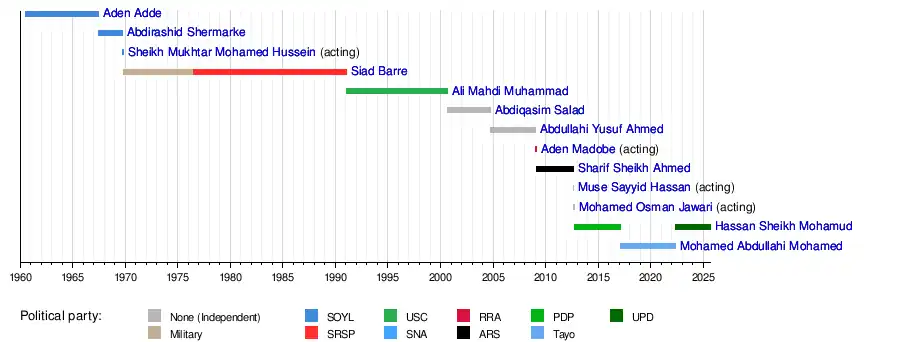 - ^ In the second half of the 1990s, different faction leaders vied for the Presidency, with none receiving international recognition. General Mohamed Farrah Aidid claimed to be President from 15 June 1995 to his death on 1 August 1996, followed by his son Hussein Farrah Aidid from 2 August 1996 to 20 March 1998.