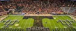 The UT Marching Band is an entirely mobile unit; its halftime complement usually includes around 310 wind instruments (necessitated by the optimal number of people to create the geometry of circle drills); a line of non-pitched and indefinite pitched percussion (pitched percussion instruments like bells and xylophones are not utilized, nor is sideline or "pit" percussion); 24 or 32 color guard; 10 majorettes; and one drum major. The UT band customarily enters the field live, playing music from the initial step-off from the sideline; it also exits the field live, most often to the music of the "Tennessee Waltz March."