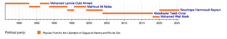 | 1 | Mohamed Lamine Ould Ahmed (born 1947) | 5 March 1976 | 4 November 1982 | 6 years, 244 days | Polisario | — | |
