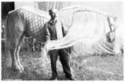 The stallion first took part in Ringling Brothers circus shows in 1892, which presented him as the heaviest and most handsome Percheron ever exported to the USA, under the name "Prince Chaldean, The Percheron Beauty ".[4] Contextualizing all shows involving physically challenged circus animals, including the Ringling Brothers circus, skeptical investigator Joe Nickell notes that these animals were often integrated into sideshows (entresorts), shows presented separately from the main tent, based on capturing the audience's interest through bon mots.[5] Numerous animals with physical peculiarities, including horses, were exhibited in the great American circus shows of the period.[6]