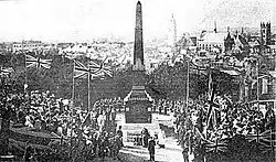An inscription on the south face records that its foundation stone was laid by Lady Butler on 4 August 1902, and (now almost illegible) that the completed memorial was unveiled on 8 August 1903 by Lady Audrey Buller, wife of General Redvers Buller.