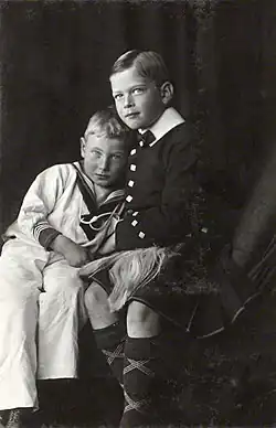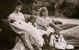 Much of John's early life was spent at Sandringham with his siblings—Prince Edward (known as David to the royal family), Prince Albert (Known as Bertie), Princess Mary, Prince Henry and Prince George—under the care of their nanny Charlotte "Lala" Bill.[4] Though a strict disciplinarian,[note 2] John's father was affectionate toward his children;[7] John's mother was close to her children and encouraged them to confide in her.[8] In 1909, John's grandaunt, the Dowager Empress of Russia, wrote to her son: "George's children are very nice ... The little ones, George and Johnny are both charming and very amusing".[9] John's aunt Princess Alice, Countess of Athlone, described him as "very quaint and one evening when Uncle George returned from stalking he bent over Aunt May and kissed her, and they heard Johnny soliloquize, 'She kissed Papa, ugly old man!'"[10] George V once told U.S. President Theodore Roosevelt that "all [his] children [were] obedient, except John"—apparently because he alone, among the king's children, escaped punishment from their father.[2]