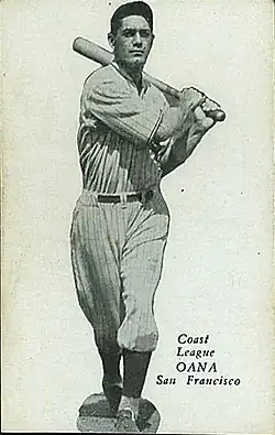 He spent the 1929 season with the Globe Bears, San Francisco's affiliate in the Class D Arizona State League.[2] Oana compiled a .374 batting average with the Bears in his first year of professional play.[11] He compiled a .413 average in 79 games for the Globe Bears at the start of the 1930 season, and was promoted to San Francisco. He joined the Seals organization with the ability to pitch or play in the infield or the outfield. Ultimately, "[h]e found himself as an outfielder being blessed with a powerful throwing arm, great speed and an ability to whack the ball to the far reaches of the parks."[12]
