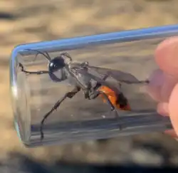 Prionyx canadensis is a species of thread-waisted wasp in the family Sphecidae.[1][2] This species can be identified by the lack of silvery hairs on the female's thorax, as present in P. parkeri and P. thomae.[2]
