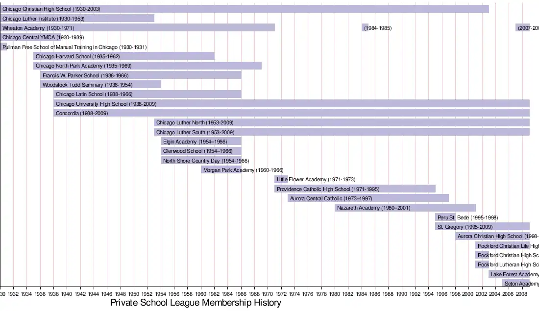 The league soon expanded with other secular and private academies. In 1931, Pullman School withdrew from the league. In 1935, Chicago Harvard School and Chicago North Park Academy joined, as did Francis W. Parker School and Woodstock Todd Seminary in 1936. Another addition to the league occurred in 1938, with Chicago Latin School, Chicago University High School, and the high school program of Concordia Teachers College joining. Chicago Central YMCA withdrew in 1939, leaving the league with a total of 10 teams as the 1940 school year commenced.