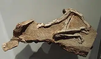 Burrer sent the specimen to Professor Eberhard Fraas of the königliche Stuttgarter Naturalienkabinett. In a lecture on 9 October 1911, Fraas referred to it by the name "Hallopus celerrimus", considering it a jumping form of dinosaur that was approximately 60 cm (2.0 ft) long, and was associated with the origin of birds.[3] Later, Fraas decided to use a different name in the official publication.[4] Fraas in 1913 named the genus Procompsognathus with as type species, Procompsognathus triassicus.[5] The type specimen is housed in the collection of the State Museum of Natural History in Stuttgart, Germany.[2]