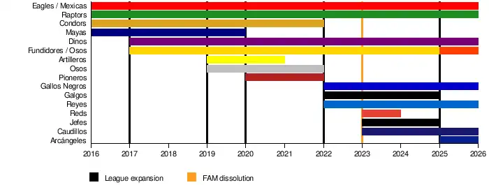 A competing league, Fútbol Americano de México (FAM), shut down operations due to financial trouble in September 2022. Three former FAM teams joined the LFA for the 2023 season: Caudillos de Chihuahua, Jefes de Ciudad Juárez and Reds de la Ciudad de México.[23][24][25]