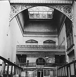 The interior was one enormous room, its 4-story walls and floor covered with multi-colored Minton tiles, an arched iron truss at mid-building decorated with machine-inspired cutouts, and skylights supported by iron trusses with similar cutouts. The front half was lit by the great Gothic window of the facade's projecting bay and a large skylight; the rear half, by another skylight and clerestory windows facing north. Rear windows from the insurance company on 4th Street opened into the tall light-filled banking room. The effect was more church-like than secular—a shrine to commerce—with a severity and logic that presaged the Chicago School of early-20th century modernism.[3]