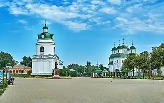 The oldest civil building in the town is the former chancellory and sacristy of the Pryluky Cossack Regiment. Apart from the diminutive Baroque church of St. Nicholas (1720), the town possesses two cathedrals. The old five-domed cathedral was built by Cossacks in the 1710s and 1720s in a simplified brand of Mazepa Baroque. The new Neoclassical cathedral (1806) has one cupola and is dedicated to the Nativity of the Theotokos.