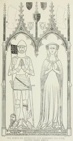 - Margaret (b. ca. 1365/70 – d. 27 June 1413), lady-in-waiting to Anne of Bohemia, the first wife of King Richard II of England. She married Sir Simon de Felbrigg (d.1351), Knight of the Garter, of Felbrigg Hall in Norfolk, Standard Bearer to King Richard II. His monumental brass in Felbrigg Church displays the paternal arms of his wife and is inscribed: Here lie Simon Felbrigg, knight, former Standard bearer to the most illustrious lord, our lord the King Richard the Second. He died on the ...day of the month of ... in the year of our Lord 14.. and the lady Margaret formerly his wife, of the nation and noble blood of Bohemia and formerly maid of honour to the most noble lady Anne, Queen of England; she died on the 27th day of June in the year of our Lord 1416; upon whose souls may God have mercy; Amen.[6]