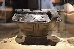 Examinations of the burial grounds, of which even the largest used continuously over periods of up to several centuries, contains no more than several hundreds graves, shows that the overall population density was low.[8] The dead were cremated and the ashes sometimes placed in urns, which had the mid-part in the form of an engraved bulge. In the 1st century AD this was replaced with a sharp-profiled (with a horizontal ridge around the circumference) shape.