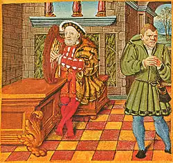 The Psalter of Henry VIII is a 16th-century illuminated psalter that belonged to Henry VIII of England. It is now in the British Library as MS Royal 2 A xvi. The king commissioned the book in the early 1540s from the French illuminator Jean Mallard, who had at one time worked for Francis I. The psalter contains eight miniatures, amongst them scenes of Henry playing the harp with his jester Will Somers in attendance, and of the king reading in his bedroom. Two scenes show Henry as King David: in one killing Goliath, in the other in the role of a penitent. The book has marginal annotations made by the king.
