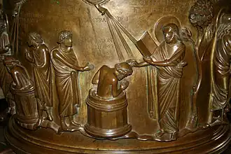 Depiction of John the Evangelist baptizing the Greek philosopher Crato on the Liege baptismal font by Renier de Huy