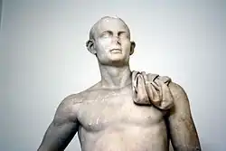 The term Pseudo-athlete is used to describe works of art from the Late Republican period in Ancient Rome that combine a veristic head with an idealized body that references Classical Greek sculpture. Verism is a style of Roman portraiture that portrays an individual with aging facial features, most notably sagging skin around the mouth and eyes, short-cropped or balding hair, and deep wrinkles on the forehead and around the eyes and mouth.[1] These features were emphasized under the tradition of verism in order to stress an advanced moral and psychological consciousness that comes along with advanced age.[2][3] The veristic features of the pseudo-athlete's head are juxtaposed with the figure's body, which is depicted in the guise of an athletic youth from Classical Greece. The pseudo-athlete's body is typically depicted in heroic-nudity with highly smooth muscular forms and are often shown in an active stance or standing in an S-shaped curve known as contrapposto.[4]