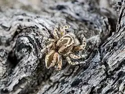 Pseudomogrus mirandus is a species of jumping spider that was first described by Wanda Wesołowska in 1996.[1] It was one of over 500 species identified by the Polish arachnologist during her career, making her one of the most prolific in the field.[2] She initially allocated it to the genus Yllenus, first circumscribed by Eugène Simon in 1868.[3] The genus is related to Araegeus, Kima and Ugandinella.[4] Particularly, genetic analysis confirmed that the genus is related to Leptorchestes and Paramarpissa, despite the different behaviours that these spiders exhibit and that some live in a completely different continent.[5] The genus is allocated to the tribe Leptorchestini within the subclade Saltafresia in the clade Salticoida.[6][7]