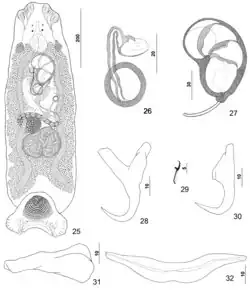 The redescription by Kritsky, Bakenhaster & Adams in 2015 includes the following: Body dorsoventrally flattened. Tegument smooth, scales absent. Cephalic region broad, with two terminal and two bilateral poorly developed lobes, three bilateral pairs of head organs, pair of bilateral groups of cephalic-gland cells at level of pharynx. Four eyespots immediately anterior to pharynx, lacking lenses; members of posterior pair slightly larger, closer together than those of anterior pair; accessory chromatic granules small, irregular in outline, usually absent in cephalic region. Pharynx ovate, muscular; esophagus short to nonexistent; intestinal ceca blind, extending posteriorly to peduncle, diverging posterior to testis. Peduncle broad. Haptor subtriangular, with dorsal and ventral anteromedial lobes containing respective squamodiscs and lateral lobes having hook pairs 2–4, 6, 7. Squamodiscs subequal, with 14 or 15 U-shaped rows of rodlets; three or four innermost rows oval, closed. Ventral anchor with elongate superficial root, long deep root having lateral swelling, slightly curved shaft, and short recurved point extending just short of level of tip of superficial root. Dorsal anchor with subtriangular base, superficial root short to lacking, moderately long deep root, slightly arcing shaft, recurved point extending past level of tip of superficial root. Ventral bar with medial constriction, tapered ends, longitudinal medioventral groove. Paired dorsal bar with enlarged medial end. Hook with elongate slightly depressed thumb, delicate point, uniform shank; FH loop nearly shank length. Testis subspherical, usually with indentation of posterior margin suggesting two posterior lobes; proximal vas deferens dorsoventrally looping left intestinal cecum; seminal vesicle a simple dilation of distal portion of vas deferens, lying just posterior to male copulatory organ; vas deferens entering large subspherical ejaculatory bulb; ejaculatory duct entering portal to male copulatory organ; large vesicle (prostatic reservoir?) lying to right of male copulatory organ. Male copulatory organ reniform, quadriloculate, with short tapered cone, elongate distal tube, and variable apparently retractile filament (usually not observed); walls of two distal chambers thick, walls of chambers becoming thinner proximally. Germarium pyriform; germarial bulb dextral, lying diagonally at body midlength, with elongate dorsoventral loop around right intestinal cecum; ootype lying to left of body midline; Mehlis' gland not observed; uterus delicate, banana shaped when empty. Common genital pore ventral, dextral to MCO. Vaginal pore sinistroventral at level of seminal vesicle; vagina with distal vestibule; vaginal sclerite having sclerotized tube with distal recurved and funnel-shaped terminus opening into vestibule; single chamber usually spherical, with thick wall; proximal vaginal canal delicate, leading to seminal receptacle. Seminal receptacle near body midline. Bilateral vitelline ducts at level of origin of uterus; vitellarium absent in regions of other reproductive organs, otherwise dense throughout trunk. Measurements: Body 733 μm long; width at level of germarium 221 μm. Haptor 187 μm wide; squamodisc 62 μm long, 81 μm wide. Ventral anchor 40 μm long; dorsal anchor 38 μm long. Ventral bar 78 μm long; dorsal bar 50 μm long. Hook 12 μm long. Pharynx 54 μm wide. Male copulatory organ 114 μm long. Testis 91 μm long, 137 μm wide. Germarial bulb 60 μm wide.[3]