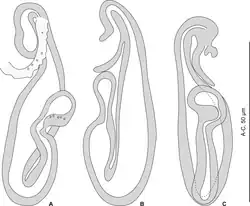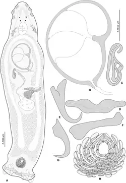 The sclerotized male copulatory organ, or "quadriloculate organ", has the shape of a bean with four internal chambers, as in other species of Pseudorhabdosynochus.[2] The vagina includes a sclerotized part, which is a complex structure, about 60 μm in length.