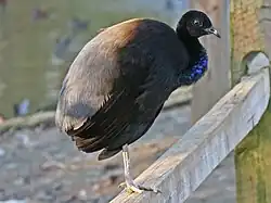 Psophia is a genus of birds restricted to the humid forests of the Amazon and Guiana Shield in South America. It is the only genus in the family Psophiidae. Birds in the genus are commonly known as trumpeters, due to the trumpeting or cackling threat call of the males.[1] The three species resemble slightly taller, longer-legged chickens in size and appearance; they measure 45 to 52 centimetres (18 to 20 inches) long and weigh 1 to 1.5 kg (2.2 to 3.3 lb).[1] They are rotund birds with long, flexible necks and legs, downward-curving bills[2] and a “hunched” appearance.[3] Their heads are small, but their eyes are relatively large, making them look inquisitive and "good-natured". The plumage is soft, resembling fur or velvet on the head and neck. It is mostly black, with purple, green, or bronze iridescence, particularly on the wing coverts and the lower neck. In the best-known taxa, the secondary and tertial flight feathers are white, grey, or greenish-black and hairlike, falling over the lower back, which is the same colour. These colours give the three generally accepted species their names.[1]