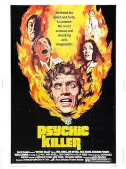 Psychic Killer is a 1975 American supernatural horror film directed by Ray Danton and written by Greydon Clark, Mikel Angel and Ray Danton. The film stars Paul Burke, Jim Hutton, Julie Adams, Nehemiah Persoff, Neville Brand and Aldo Ray.[1][2][3] The film was released in December 1975, by AVCO Embassy Pictures. Originally released under the alternate title The Kirlian Force, it was changed to Psychic Killer to emphasize the more sensational horror scenes of the film.
