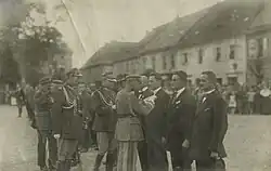 During the Polish January Uprising in 1863 Poles smuggled large amounts of gunpowder through the town to the Russian Partition of Poland.[5] From 1871 Pleß was part of Germany, however, at the beginning of the 20th century, over 80 percent of the district's population spoke Polish; during the 1910 census 86 percent declared as Polish speakers,[6] though in the town itself the percentage of Polish speakers was 33.[7] When World War I erupted, the Hochbergs lent the estate to the German state for military purposes. The German chief of staff held his headquarters at the castle of Pleß, often visited by Emperor Wilhelm II himself.