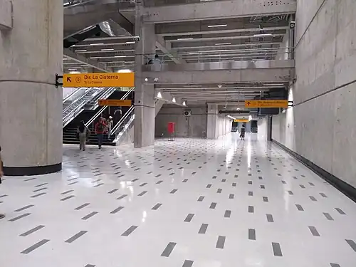 Puente Cal y Canto is a transfer station between the Line 2 and Line 3 of the Santiago Metro. Originally named Mapocho, it was renamed to Puente Cal y Canto shortly after its opening. This name is taken from the former bridge on the Mapocho River, whose remains were found during the construction of the station. The station's platforms walls have a decoration that resembles the architecture of the mentioned bridge. The Line 2 station was opened on 15 September 1987 as the northern terminus of the extension of the line from Los Héroes. On 8 September 2004 the line was extended to Cerro Blanco. The Line 3 station was opened on 22 January 2019 as part of the inaugural section of the line, from Los Libertadores to Fernando Castillo Velasco.[2]