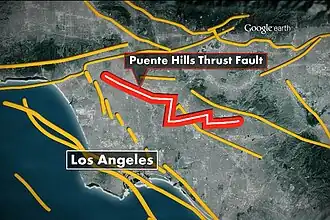 The Puente Hills Fault thrust system runs 40 km (25 mi) across the northern Los Angeles Basin from Downtown Los Angeles to near Brea and the Chino Hills in northern Orange County. It may account for some of the shortening in the northern Los Angeles Basin.[1]
