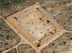 The pueblo was built out of hand-hewn sandstone blocks in a rectangular shape, surrounding an interior plaza. The single story consisted of rooms used as living quarters and storage areas. Kivas, where ceremonies took place, were also present underground. The exterior walls of the pueblo contained no windows or doors, entry was accomplished by ladders over the walls.[5]