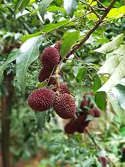 The fruit is ovoid, 5-7.5 cm long, dark red, with its thick, leathery rind closely set with conical, blunt-tipped tubercles or thick, fleshy, straight spines, which are up to 1 cm long.[2] There may be one or two small, undeveloped fruits nestled close to the stem. Within is the glistening, white or yellowish-white flesh (aril) to 1 cm thick, more or less clinging to the thin, grayish-brown seedcoat (testa) which separates from the seed. The flavor is generally much sweeter than that of the rambutan.[2] The seed is ovoid, oblong or ellipsoid, light brown, somewhat flattened on one side, and 2 to 3.5 cm long.