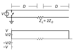 A disadvantage of simple PFN pulse generators is that because the transmission line must be matched to the load resistance RL to prevent reflections, the voltage stored on the line is divided equally between the load resistance and the characteristic impedance of the line, so the voltage pulse applied to the load is only one-half the power-supply voltage.[1][2]