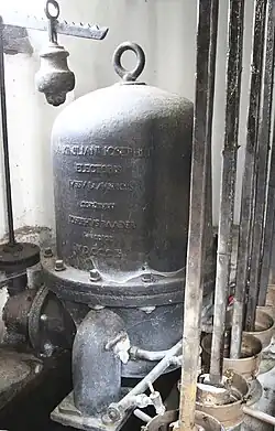Behind the pressure vessel, there is a pressure control valve which is controlled by an iron weight suspended from a gear rack thus making up an adjustable automatic valve.