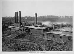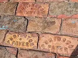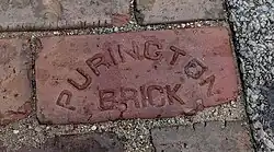 In 1890, brothers Dillwyn V. and William S. Purington purchased Grosscup's brickyard, and established the Purington Paving Brick Company. They continued to expand their operations, and bought out several local companies: Pioneer Brick Company, Galesburg Brick Company, Galesburg Brick and Terra Cotta Company, and the Galesburg Paving Brick Company.[3] Soon after the Puringtons bought the brickyards, they began production of the famous "Purington Pavers," which were easily identifiable by the raised text on some of the bricks. Purington Pavers were used all across the world. Although most common in the Midwest, they were used in places from Chicago to the Bazaar in Bombay, India. East Galesburg-area soldiers fighting in WWI reported seeing Purington Pavers in the streets of Paris.[1] During the building of the Panama Canal, Purington bricks were used to pave the streets in Panama City, and roads used during construction of the canal.[2][4] For Many years, it was the largest brick paver producer in the world.[5] During its height, Purington could produce over 150,000 bricks a day. [1]