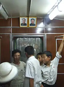 The former Berlin trainsets were given a new red and cream livery in Pyongyang.[43] All advertising was removed and replaced by portraits of leaders, Kim Il Sung and Kim Jong Il. In 2000, a BBC reporter saw "old East German trains complete with their original German graffiti".[10] Koryo Tours in another article write about and show the old West-Berlin D-trains, suggesting that the BBC article could have mixing them up with the Class GI of East Berlin.[43] After about 2006, Type D cars were mainly used. The Class GI rolling stock has been banned from underground tunnel operations due to frequent control stand fires and was withdrawn from Metro service in 2001, and those cars are now operating on the railway network around Pyongyang and northern regions as commuter trains.[44][45] One Type D metro car appears to have been converted into a departmental vehicle, with a subsequently installed second driver's cab at the car's back next to the inter carriage door. The metro car is painted in yellow with red warning trims.[46]