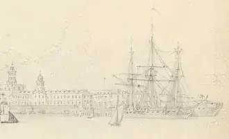 ![]() HMS Pyramus at Portsmouth Dockyard on 6 September 1825, drawn by John Christian Schetky