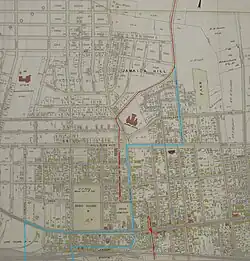 The original Flushing–Jamaica Line, nicknamed the "Toonerville Express",[10] began at the intersection of Broadway and Lawrence Street (now Northern Boulevard and College Point Boulevard respectively) at the northern edge of Downtown Flushing near Flushing Creek. It ran east to Main Street, then south along Main Street and Jamaica Avenue (now Kissena Boulevard) to Sanford Avenue. It then ran short distances east along Sanford, south along Bowne Avenue (now Bowne Street), east on Forest/Franconia Avenue (45th Avenue), and south on 162nd Street to Pigeon Meadow Road at the west edge of the Flushing Cemetery. The line proceeded south for five miles along an undeveloped right-of-way owned by the railroad, which would later become 164th Street, to what is now Normal Road, a few blocks north of Hillside Avenue. The line ran short distances west to a point between Parsons Boulevard and 153rd Street, south to 90th Avenue, and west to Washington Street (later 160th Street) ending at Jamaica Avenue in Downtown Jamaica.[1][6][11][12][13] The line shared a terminal at 160th Street and Jamaica Avenue with the trolley lines of the Long Island Electric Railway, which operated streetcar lines to Far Rockaway, Brooklyn, and Belmont Park.[2][6][14] On Sundays, a shuttle service ran to take passengers from Downtown Flushing to Flushing Cemetery.