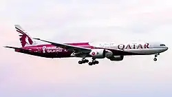 In May 2007, Qatar Airways and Airbus signed a memorandum of understanding (MoU) for the acquisition of 80 Airbus A350 XWBs, including 20 Airbus A350-800s and 20 aircraft of the –900 and –1000 variant, respectively, with the first aircraft initially slated for delivery in 2013.[46] The agreement was firmed up in June during the 2007 Paris Air Show;[47] three more Airbus A380s were also made part of the order.[48] In July of the same year, during the unveiling ceremony of the Boeing 787 in Everett, Qatar Airways was recognised as a future customer for the type when its logo appeared on one side of the brand new aircraft. By that time, the airline had not acknowledged that it had placed an order for a number of these new aircraft.[49] In November the same year, a firm order for 30 Boeing 787-8s, plus options for 35 more aircraft of the –9 or –10 variant, was confirmed. The order also included 14 Boeing 777-300ERs, six Boeing 777-200LRs and seven Boeing 777Fs, whereas five more aircraft of the type were on option. The combined order was valued at US$13.5 billion.[50][51] The airline took delivery of its first 335-seater Boeing 777-300ER in late November 2007.[52] The route network grew further during 2007 with the incorporation of Newark in June,[53] Nagpur —the carrier's seventh destination in India— in September,[54] and Stockholm in November.[55] A new scheduled service to New York-JFK that commenced in November 2008 replaced the Newark route.[53] The first two Boeing 777-200LRs were handed over by the aircraft manufacturer in February 2009.[56] On June 15 of the same year, at the Paris Air Show, Qatar Airways ordered 20 Airbus A320 and four Airbus A321 aircraft worth $1.9bn.[57] On October 12, 2009, the company completed the world's first commercial passenger flight powered by a fuel made from natural gas.[58] Also in 2009, Qatar Airways launched its first scheduled flights to Australia with Melbourne being the first city served;[59] routes to Chengdu, Hangzhou, Phnom Penh and Clark International Airport in the Philippines were launched during 2009 as well.[45]