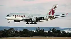 A fourth A300-600R on lease from AWAS joined the fleet in April 2000.[27] In October 2000, Qatar Airways ordered an International Aero Engines V2500-powered Airbus A319CJ and took an option for another aircraft of the type.[28] The airline became the Airbus A380's ninth customer in 2001 when two aircraft of the type were ordered, plus two options.[29] Also that year, the airline resumed services to Jakarta.[30] A year later, in May, Qatar withdrew from Gulf Air to ensure the development of its national airline.