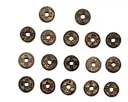 Lead cash coins (traditional Chinese: 鉛錢; simplified Chinese: 铅钱; pinyin: qiān qián; Vietnamese: Duyên tiền;[a] Japanese: 鉛銭 (なまりせん); Rōmaji: Namarisen) are a type of Chinese, Japanese, and Vietnamese cash coin that were produced at various times during the monetary history of imperial China, Japan, and Vietnam. Typically cash coins produced in China between 300 BC and 1505 AD were made of bronze and those produced after 1505 AD were made of brass.[1] But, like with iron cash coins, at times when copper was scarce government authorities would produce lead cash coins to supplement the money supply and maintain market liquidity.
