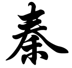 According to the Shuowen Jiezi, the character for Qin is a compound ideogram which combined two characters: chong 舂 "to pound", and he 禾 "grain".[2] The character originally refers to Qin Valley (秦谷) in Longxi near Tianshui, Gansu and became the name of that area. The area was granted to Feizi, a descendants of Gao Tao, by King Xiao of Zhou as a fief in the 9th century BC, which then grew into the state of Qin. In the 3rd century BC, the state of Qin unified China and became the first imperial dynasty under Qin Shi Huang. After the fall of the dynasty in 206 BC, the descendants of Qin royalty, whose ancestral name was Yíng (Chinese: 嬴), was said to have adopted the surname Qin.[1] Many people sought to identify themselves with the Qin long since the fall of the Qin dynasty; in Japan, the Hata clan of Japan claims descent from a branch of the Qin royal family, "Hata" being the native Japanese reading for the character "Qin".[3]