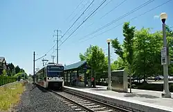 Designed by the architectural group OTAK Inc., the station features a single island platform between the two tracks.[15] Located on northwest Quatama Road at northwest 205th Avenue in Hillsboro, the station is served by the MAX Blue Line.[16] The station includes a park-and-ride lot, bike lockers, bike racks, has a variety of public artwork, and is compliant with the Americans with Disabilities Act.[16] It was situated in fare zone 3 until TriMet discontinued all use of fare zones, in September 2012. The station sits on 3.35 acres (13,600 m2) on the south side of the rail line.[17] The construction of townhomes and condominiums in the area was a result of the station.[18]